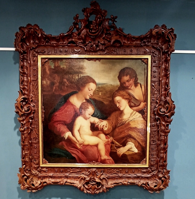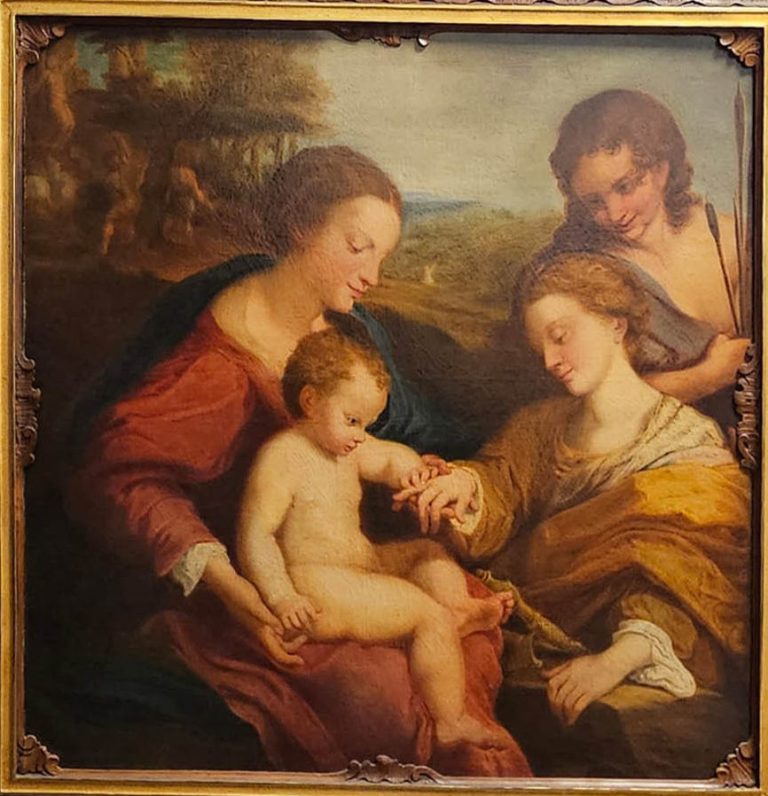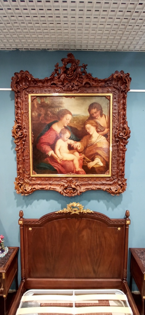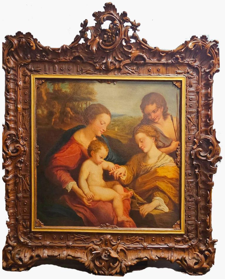 Большая итальянская картина первой половины XVII века. Масло на холсте, приписываемая последователю знаменитого художника Антонио Аллегри, известного как Корреджо (1489-1534). Картина отличается замечательным живописным качеством и является превосходной копией «Мистического бракосочетания святой Екатерины Александрийской в присутствии святого Себастьяна», которая сейчас выставлена в Лувре в Париже. Из всех версий этой картины, написанных Корреджо за свою карьеру, эта — одна из самых элегантных и изысканных. Легенда гласит, что после крещения юная женщина увидела видение. Ей явилась Мадонна с младенцем Иисусом на коленях, который надел кольцо на палец Екатерины, сделав её своей невестой. Центральным элементом картины являются руки Девы Марии, младенца и святой Екатерины. Действительно, все взгляды устремлены на этот эмоциональный центр, включая взгляд святого Себастьяна. Обратите внимание на сцену мученичества святого на заднем плане слева. Антикварная, несовременная рама из резного дерева, богато декорированная. Работа подверглась реставрации, включая перетяжку, замену подрамника и восстановление цвета в небольших участках. В целом, в отличном состоянии.