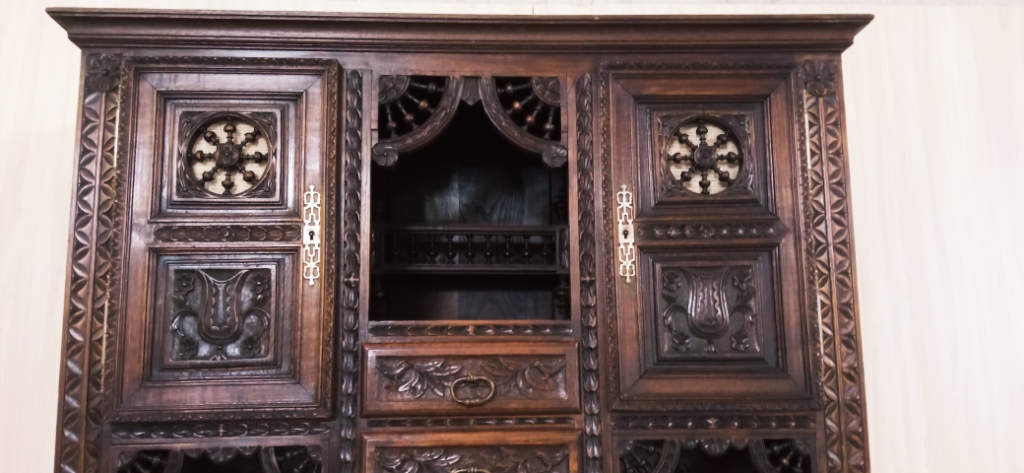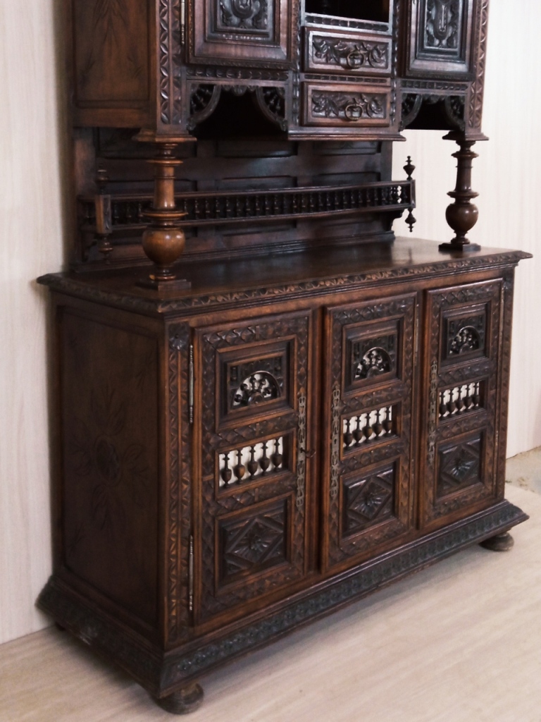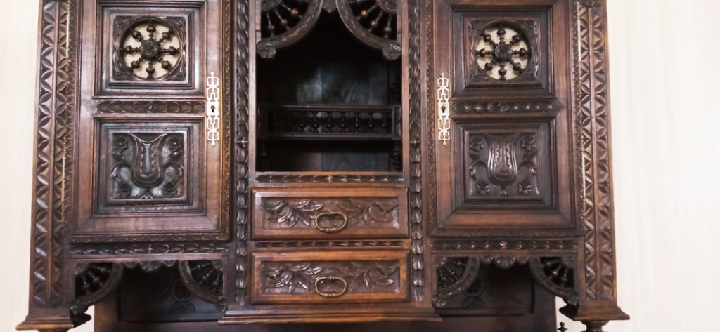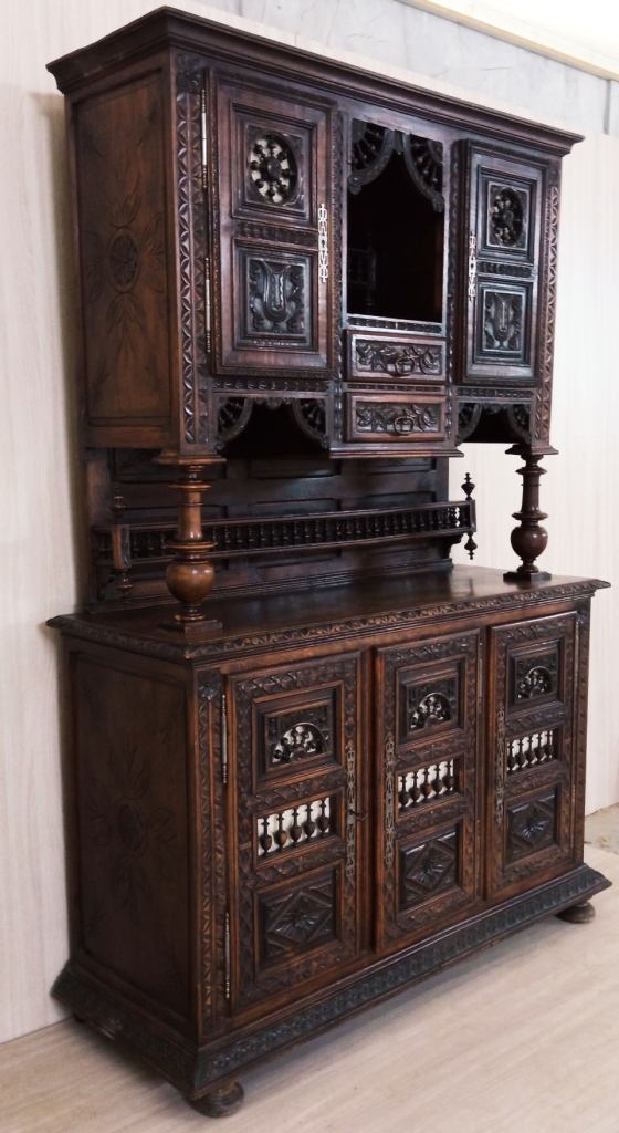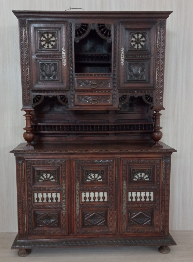Он изготовлен из красного дерева и дуба и представляет собой шкаф дверцами и выдвижными ящиками. Буфет украшен резьбой и орнаментами, характерными для бретонского стиля, который прославился своими яркими и насыщенными декоративными элементами.