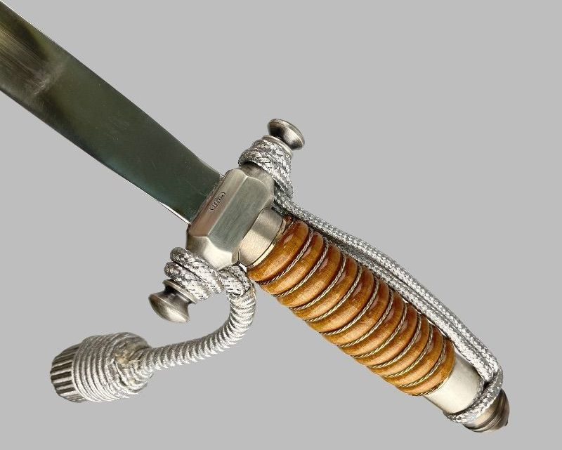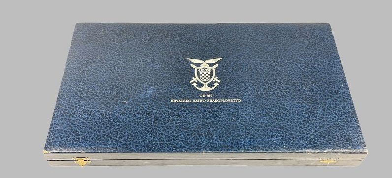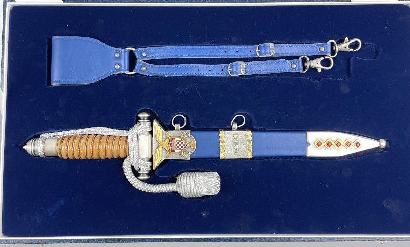 Клинок прямой двулезвийный, трёхгранный в сечении с пятой. Рукоять деревянная с желобками по которым переложена витой латунной проволокой. Прибор эфеса (крестовина, верхняя втулка и головка) изготовлен из белого металла. На перекрестье крестовины проставлено клеймо — IKOM ZAGREB в овале. Ножны металлические обтянуты синей кожей с прибором из белого матового металла состоящим из устья с подвижным кольцом, обоймицы с подвижным кольцом и наконечника с шариком. Устье имеет рельефную эмблему и герб (эмаль и декор под золото), обоймица так же украшена переплетёнными канатами (золотого цвета) и буквами OS RH (золотого цвета). Наконечник декорирован галунами из красного стекла. Декор прибора ножен на лицевой стороне. Кортик комплектуется темляком из белой металлической нити и оригинальным подвесом. На крышке пенала имеется надпись на хорватском языке — OS RH HRVATSKO RATNO ZRAKOPLOVSTVO (ХОРВАТСКАЯ ВОЕННАЯ АВИАЦИЯ).