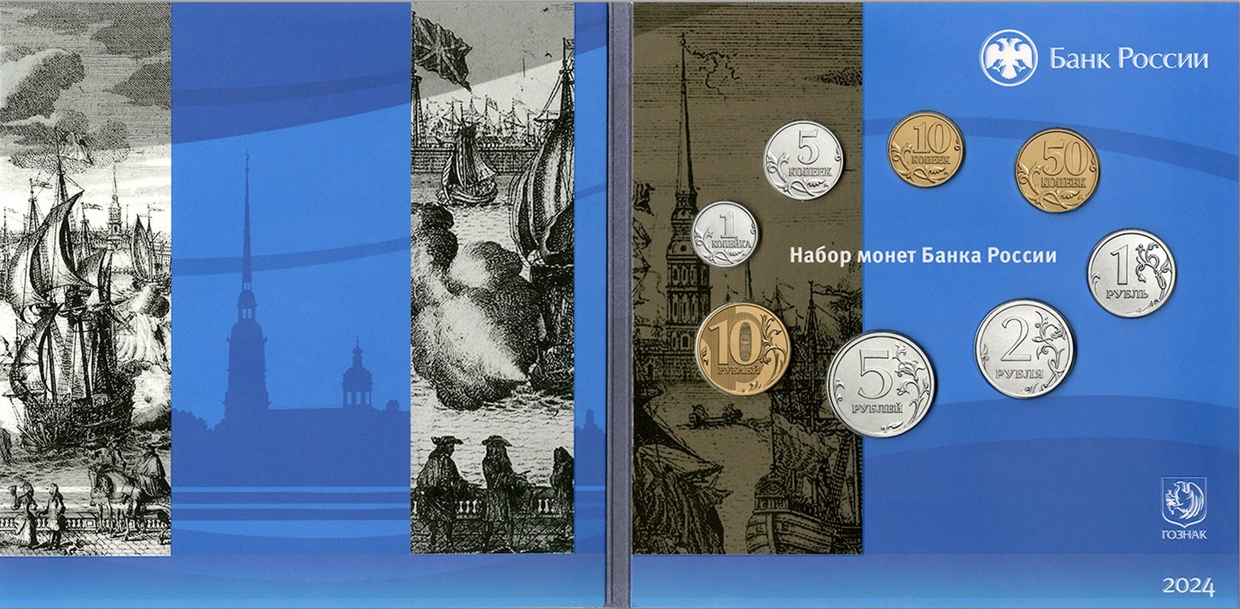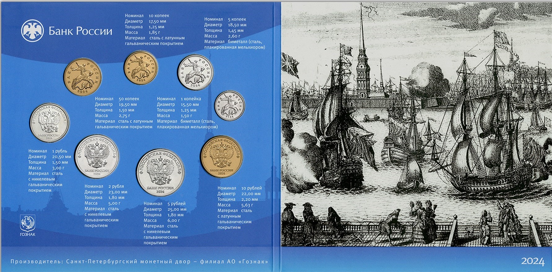 Монеты номиналом 1, 5, 10 и 50 копеек расположено рельефное изображение Георгия Победоносца верхом на коне, поражающего копьем змея, по окружности — надпись «БАНК РОССИИ» и дата «2024», справа — буквы С-П (Санкт-Петербург), обозначающие монетный двор — изготовитель;