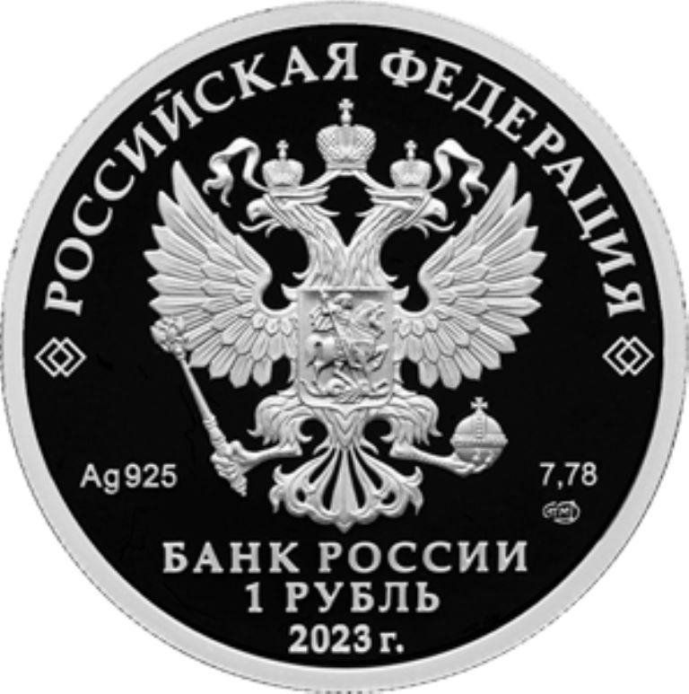 Рельефное изображение Государственного герба Российской Федерации, над ним вдоль канта — надпись полукругом «РОССИЙСКАЯ ФЕДЕРАЦИЯ», обрамленная с обеих сторон сдвоенными ромбами, под гербом: слева — обозначения драгоценного металла и пробы сплава, справа — содержание химически чистого металла и товарный знак монетного двора, внизу в центре в три строки — надпись «БАНК РОССИИ», номинал монеты «1 РУБЛЬ», год выпуска «2023 г.». |
