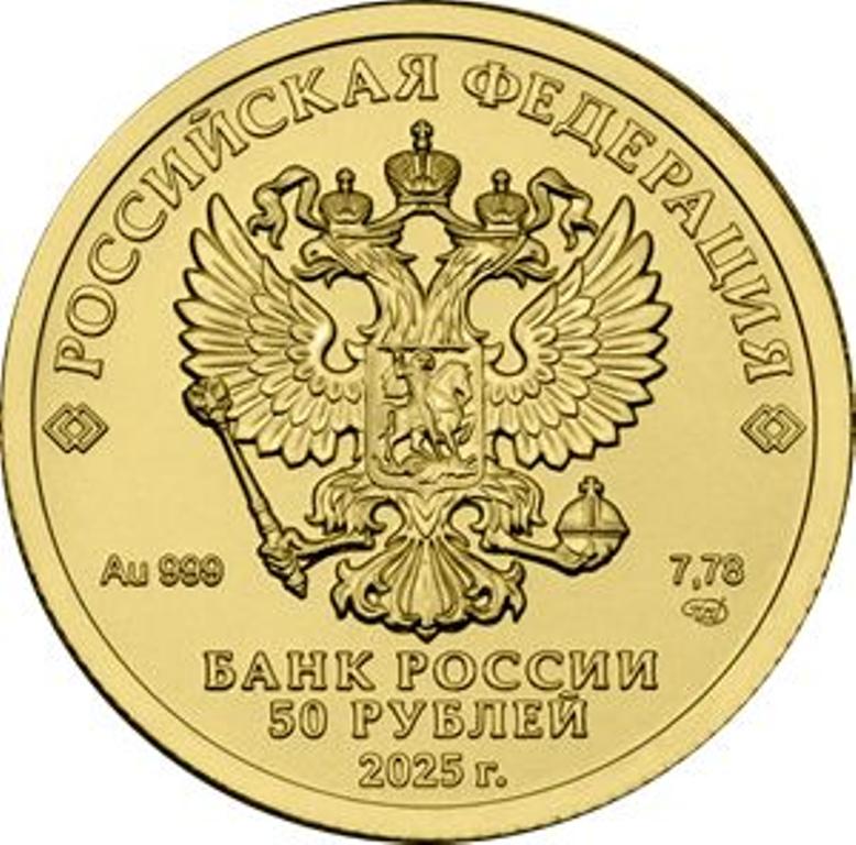 В центре — рельефное изображение Государственного герба Российской Федерации, над ним вдоль канта — надпись полукругом: «РОССИЙСКАЯ ФЕДЕРАЦИЯ», обрамленная с обеих сторон сдвоенными ромбами, внизу под гербом: слева — обозначения драгоценного металла и пробы, справа — содержание химически чистого металла и товарный знак монетного двора, внизу в центре в три строки — надпись: «БАНК РОССИИ», номинал монеты: «50 РУБЛЕЙ», год выпуска: «2025 г.». |